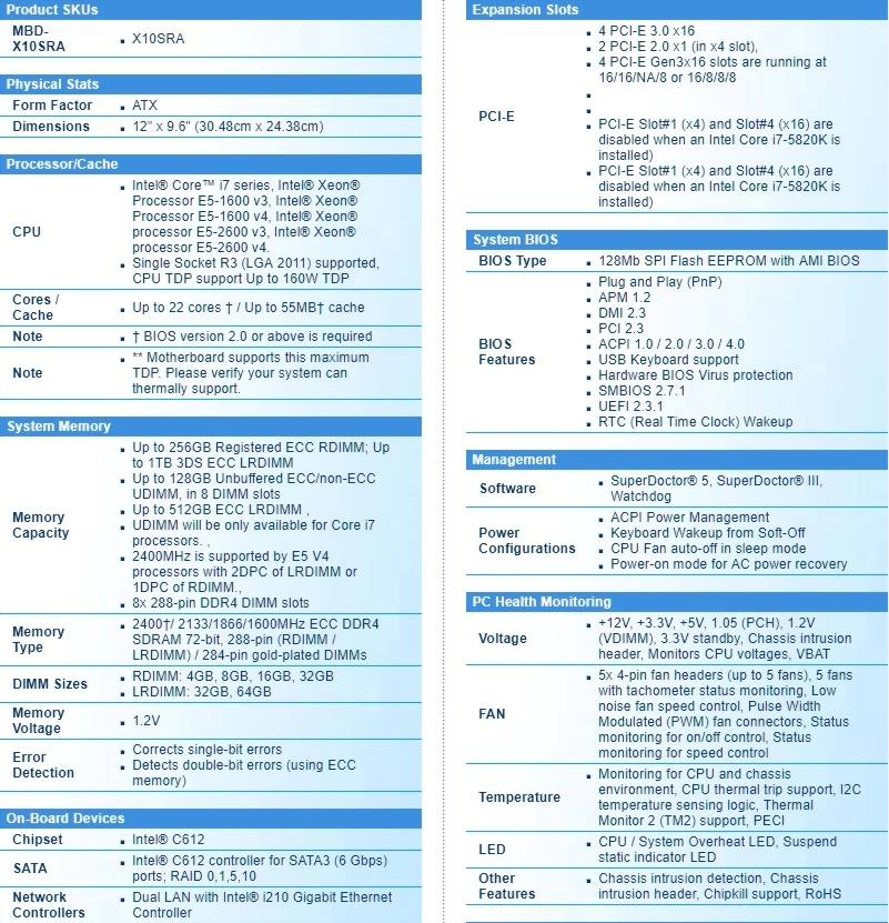 Single socket R3 (LGA 2011) supports,Intel® Xeon® processor E5-2600 v4†/ v3, E5-1600 v4†/ v3, Core i7,Intel® C612 chipset,Up to 512GB ECC DDR4 2400†MHz LRDIMM or 128GB ECC/non-ECC UDIMM (available with Core i7 only); 8 DIMM slots